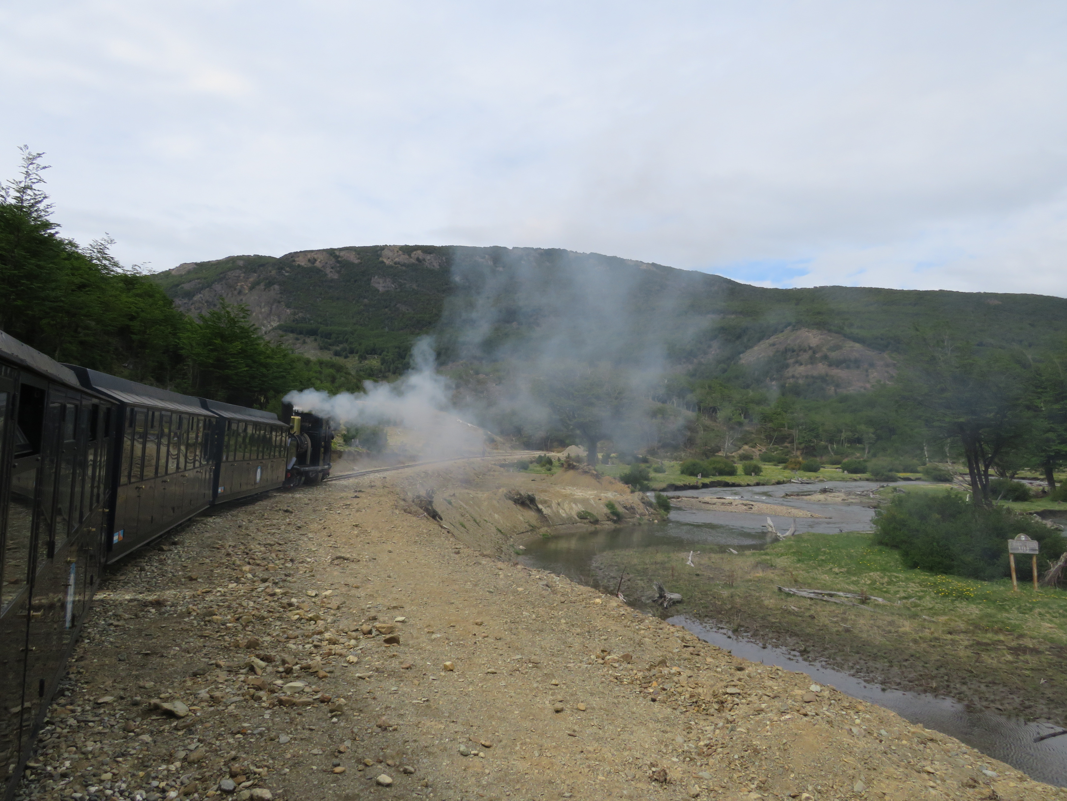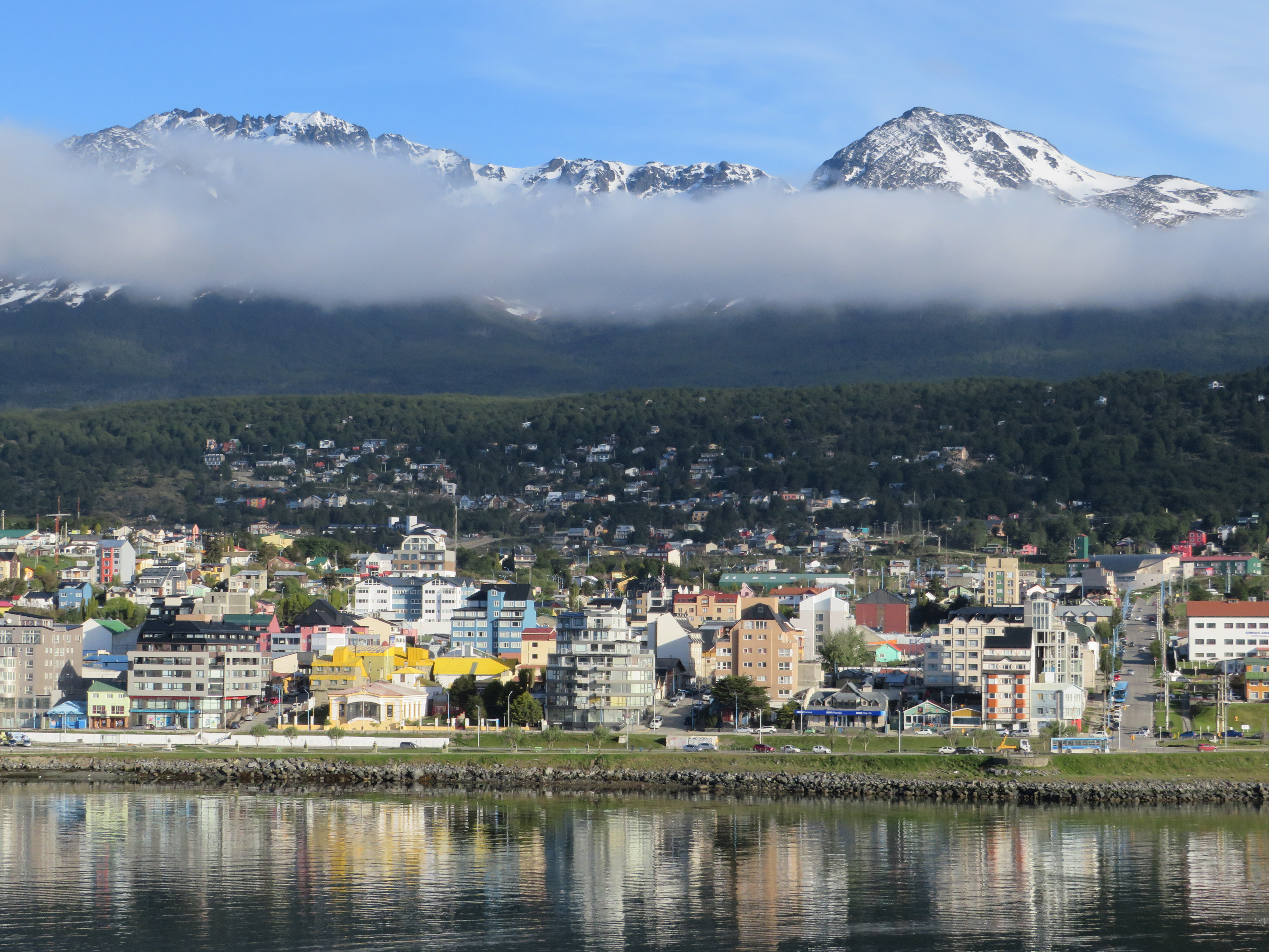 Gisteren waren we de hele dag in Ushuaia. In de meest zuidelijke stad van de wereld en Zuid-Amerika is het lente, de paardenbloemen bloeien, net als 2 gouden-regen-bomen die ik in de stad zag. Deze dag hadden we een tour geboekt. Met een bus reden we het natuurgebied van de “Tierra del Fuego” oftewel Vuurland in naar het meest zuidelijke postkantoor waar je een kaart met stempel Vuurland zou kunnen versturen, alleen het postkantoor was gesloten. Na een fotostop een kort ritje naar het meest zuidelijke treinstation. Daar stond de trein al op ons te wachten. Het treintje rijdt op smalspoor, slechts 50 cm breed. Het was bepaald geen TGV, we reden met een slakkengangetje door een prachtig landschap met een sneller stromend riviertje, geflankeerd door hoge bergen met eeuwige sneeuw. We eindigden na een half uur op het eindstation dat vlak naast de meest zuidelijke golfbaan ter wereld ligt. ’s Middags hebben we nog in de hoofdstraat van Ushuaia rondgeslenterd en gewinkeld. Opvallend de felle kleuren waarin de huizen zijn geschilderd; volgens de gids is het een reactie op de nogal grijze dagen het grootste deel van het jaar: het regent in Ushuaia 200 dagen per jaar… Wij hadden een behoorlijk zonnige dag en ook vandaag schijnt de zon volop!