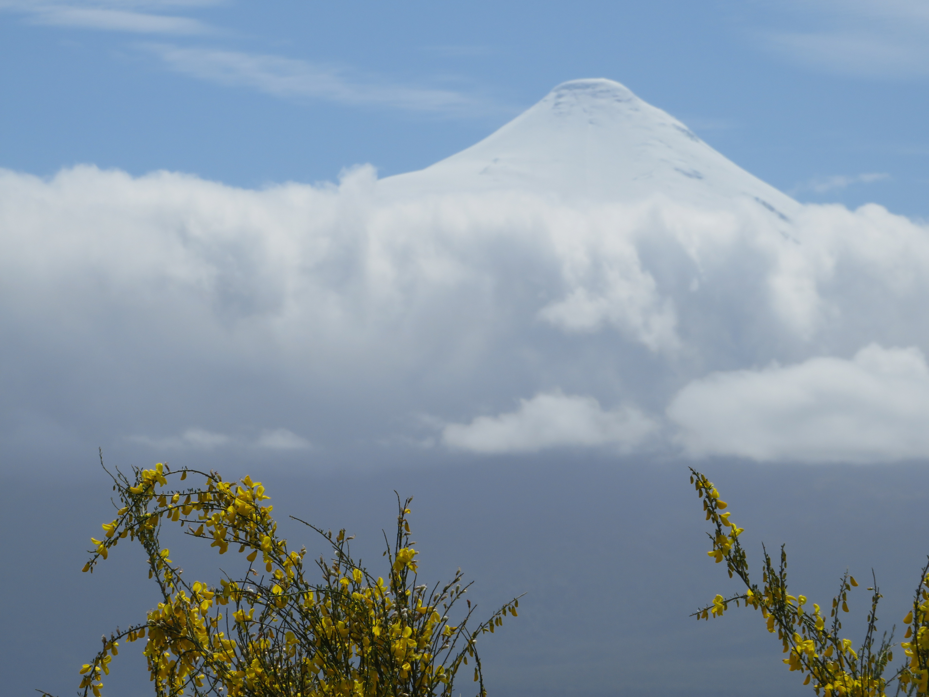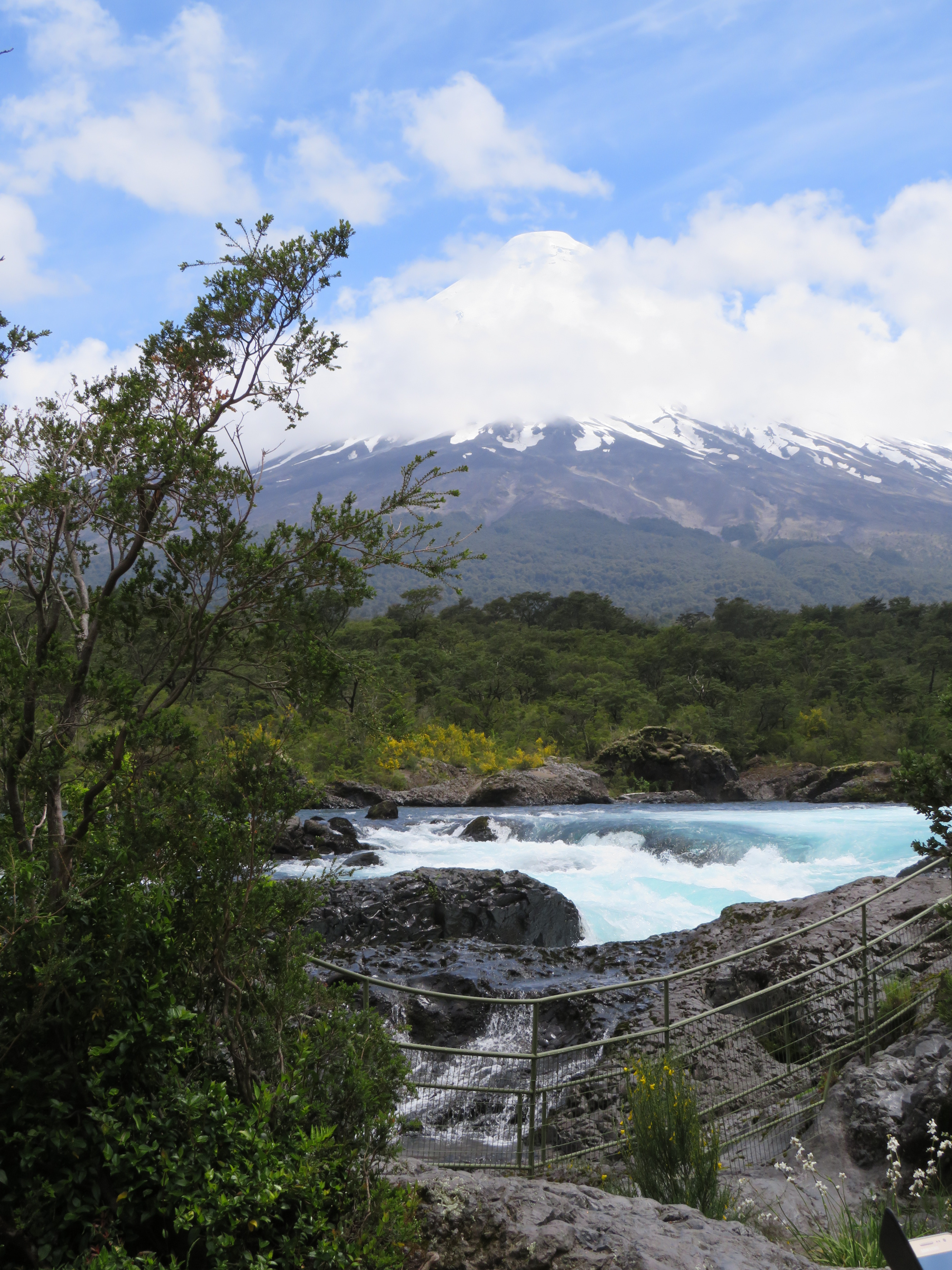 Gisteren hadden we een landdag in Puerto Montt; je schrijft het écht met 2 t’s. Het plaatsje zelf vond ik er redelijk welvarend uit zien. We hadden deze keer geen AIDA-tour geboekt, bij de uitgang stonden tientallen taxichauffeurs zich te verdringen om ons toeristen een poot uit te draaien. Uiteindelijk gingen we met José naar de watervallen en het stadje Puerto Varas aan het Lago Llanquihué. Dat is een dorpje waar in het verleden heel veel Duitsers zich hebben gevestigd, ook al voor de Tweede Wereldoorlog. Onderweg werd het weer steeds beter en helderder. We hadden zo een prachtig uitzicht op de vulkaan de Osorno met een heel gelijkmatig gevormde kegel, die helemaal bedekt was met sneeuw… Bij de watervallen “Saltos del Petrohué” zo'n 30 kilometer verderop in het natuurgebied Parc Nacional Vicente Pérez Rosales viel het erg op, dat de bodem bestond uit zwarte lava die er zeker nog geen tientallen jaren heeft gelegen.. Er zal nog niet zo heel lang geleden een uitbarsting van de Osorno zijn geweest…