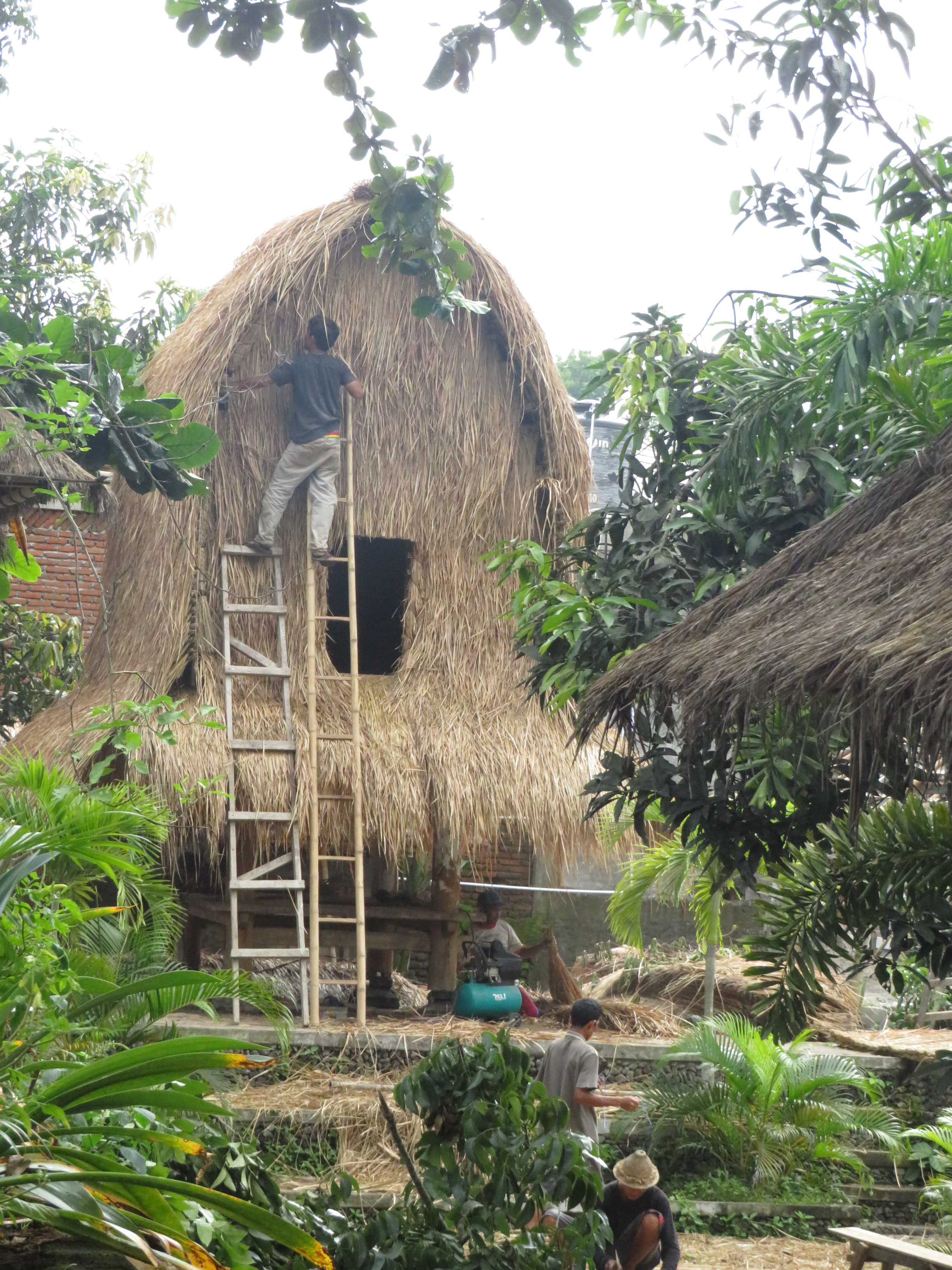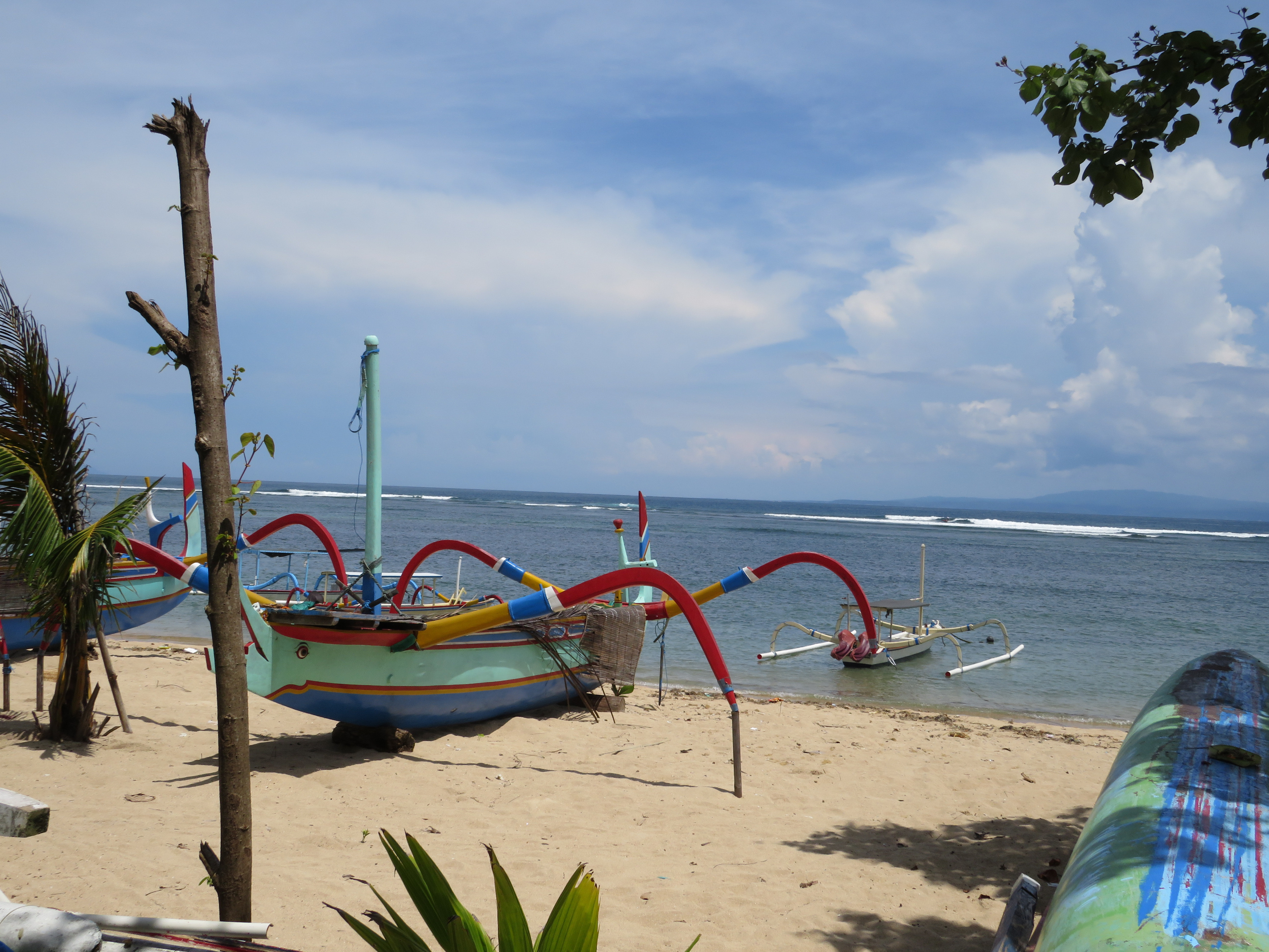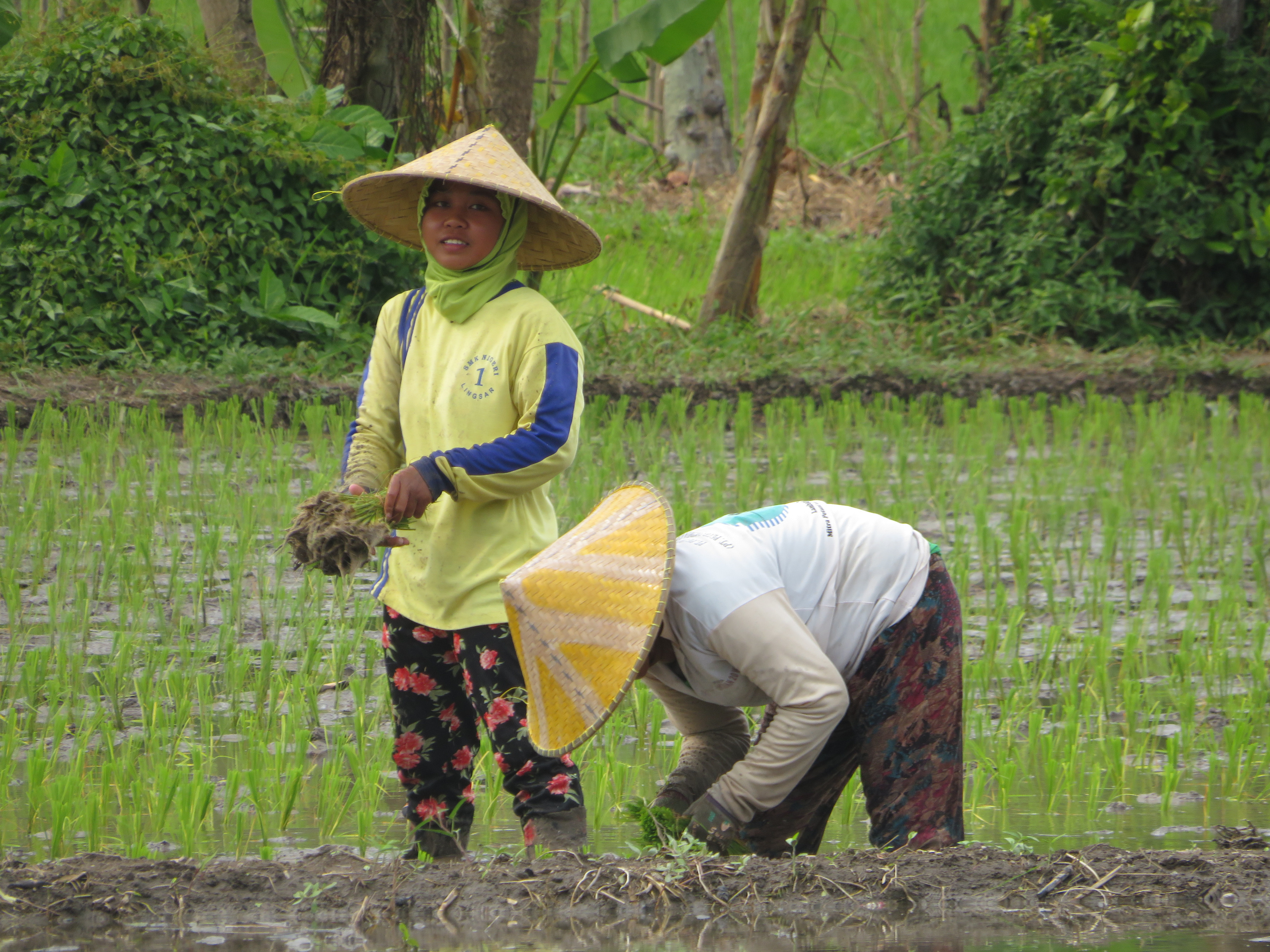 Op Lombok hebben we zelf een tour georganiseerd, Henny deed het onderdeel tawarren, het onderhandelen over de prijs. We wilden naar mooie sawah's, naar een dorpje van de oorspronkelijke bewoners, de Sasak, en hun Sasak-huizen en we wilden naar een leuk restaurantje… Onze chauffeur sprak geen woord Engels, dus alles ging heerlijk in het Bahasa Indonesia. Maar hij verzorgde een heerlijk dagje uit voor ons en het restaurant dat hij had uitgezocht was helemaal naar ons zin… Gelukkig zat de sambal in een apart schaaltje, ik deed maar een heel klein beetje op mijn witte rijst, maar de vlammen sloegen van mijn lippen, heerlijk! Verder heb ik me heerlijk vermaakt door de sawah’s in te lopen en 10 rijst-plantende vrouwen even van hun werk te houden. Zij vonden het leuk en ik ook! “Waar kom je vandaan?” “Hoe heet je?” “Hoe komt het, dat je zo goed Indonesisch spreekt?” ‘s Avonds kregen we nog een flinke tropische regenbui op ons dak. Om half negen vertrokken we uit Lembar voor de vrij korte oversteek naar Bali…