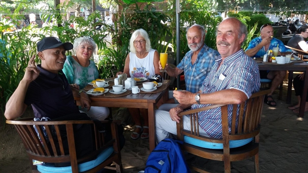 In de haven van Benoa werden we ontvangen door beeldschone, maar zwaar opgemaakte Balinese schoonheden met een gamelan-orkest op de achtergrond. Even verderop stond Nengah, onze chauffeur van de jaren daarvoor ons al op te wachten. We werden hartelijk omhelsd en we wensten elkaar gelukkig nieuwjaar “selamat Tahun Baru 2018”. Op de weg was het opmerkelijk rustig, waarschijnlijk door het verminderde toerisme ten gevolge van de dreigende uitbarsting van de Gunung Agung, die overigens zelfs nog niet eens een klein rookpluimpje produceerde… Nengah bracht ons naar Sanur en aan het eind van de Jalan Sindhu stapten we uit bij het Inna Sindhu Beach hotel, waar we de laatste 3 jaren steeds van half januari tot half maart logeerden met OBI (Overwinteren Bali Indonesië). Bij Luhtu’s Coffeeshop zat onze Balinese vriend I Nyoman Duari ons al op te wachten. Ook met hem was het knuffelen en gelukkig nieuwjaar wensen. Heerlijk om weer onder het dichte bladerdek en met een zuchtje zeewind te genieten van "kopi kapucino" met een mango-taartje. Helaas was Mushtar voor de begrafenis van zijn overleden zus terug naar Madura, zodat we tussen de middag geen saté bij hem konden eten, het werd nasi rames, saté en gado-gado op het strand van het Sindhu Beach hotel… Rainer en ik liepen naar golfbaan van het Bali Beach hotel om wat golfspulletjes te kopen, Henny en Marian kochten tasjes, horloges en andere zaken, waarvan ik me steeds afvraag of ze wel echt nodig zijn… Op heel veel plekken werden Henny en ik uitbundig begroet met papa Douwe en mama Henny, de meesten begrepen er ondanks uitleg niets van, dat we maar 1 dag zouden blijven en dat we op een wereldreis met de Aidacara waren.. Heel erg moe, maar zeer voldaan waren we om een uur of 5 terug op de boot. Voor Marian, Henny en mij was dit afscheid nemen van ons tweede vaderland… ’s Avonds bleek, dat we voor Sanur langs om Bali heen zouden varen en door de Javazee naar Singapore zouden gaan. En dan zit 2/3 van onze reis er al weer op…