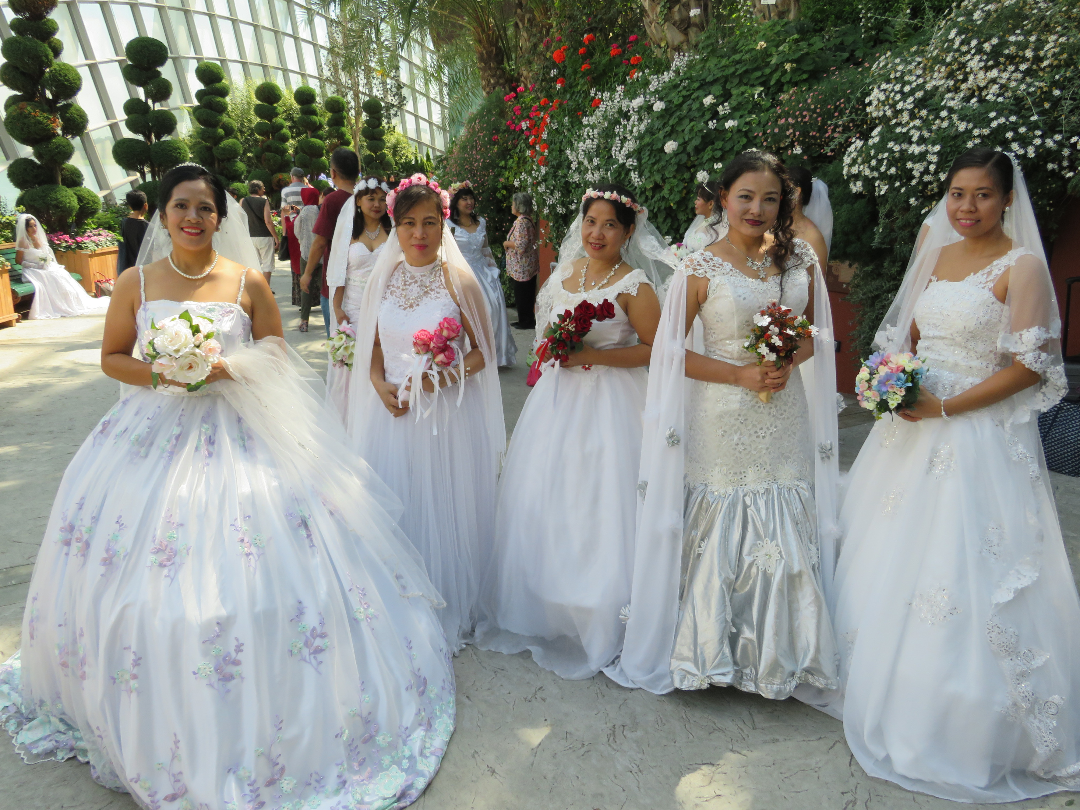 Omdat het derde deel van de reis, het stuk Singapore-Hamburg hier begon, lagen we 2 dagen in Singapore. Onze tocht ging op de tweede dag naar de Gardens by the Bay, weer in de buurt van de Marina Bay. Twee prachtig aangelegde overdekte tuinen met een lekker temperatuurtje, niet zo verschrikkelijk warm als buiten. Eerst gingen we in een restaurantje lekker koffie drinken, waar we plotseling een stuk of 10 bruiden rond zagen lopen: het bleken leden van een “dress making club” te zijn. Ik heb, geloof ik, met een stuk of 5 dames in bruidskleding geposeerd. Na de Gardens waren we heel erg moe en niet ieder van ons was helemaal fit, zodat we richting boot gingen en ons verder rustig hielden…