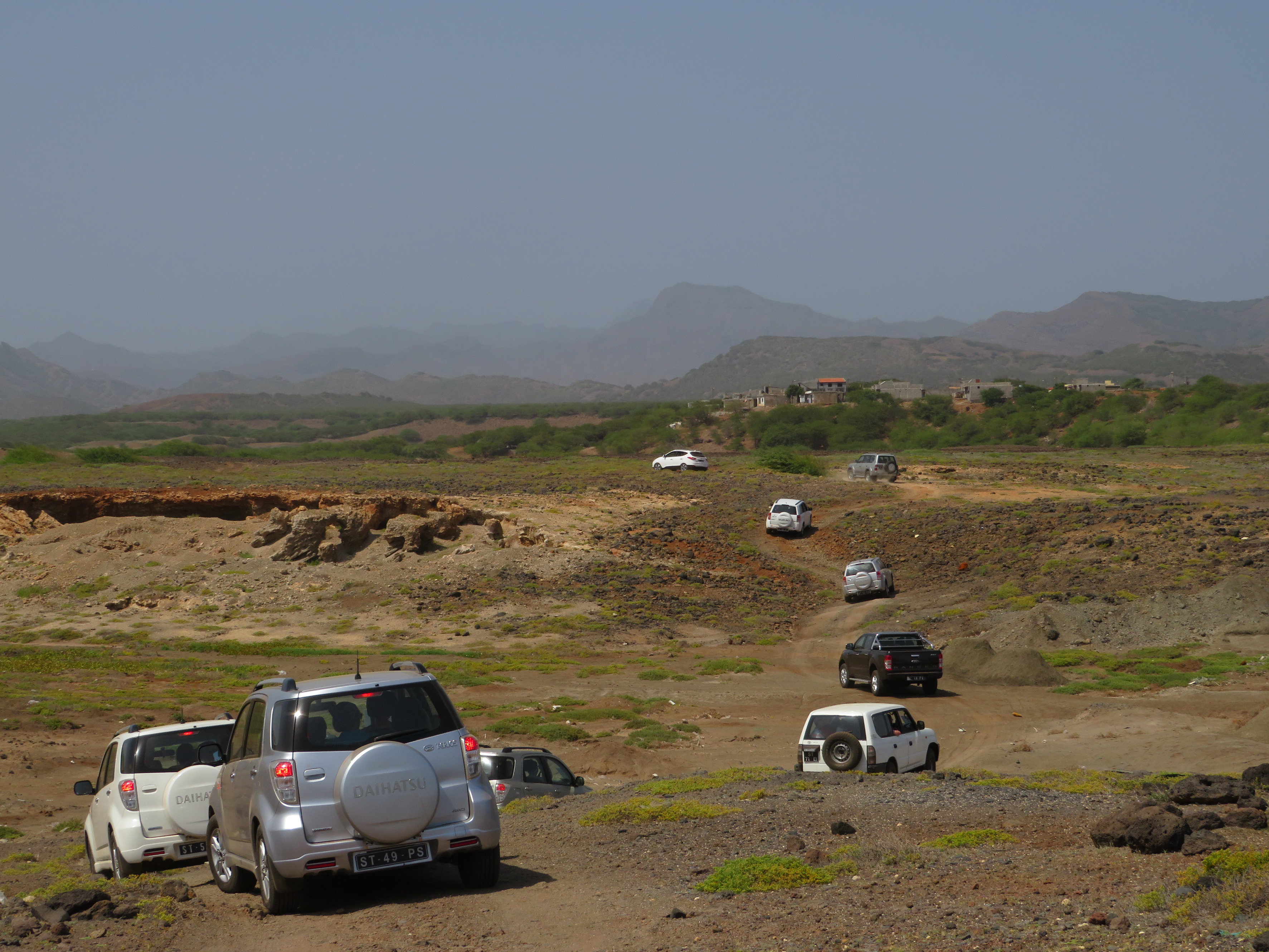 Van de Kaapverdische eilanden hebben we alleen vanuit Praia een stukje van eiland Santiago gezien, maar dat was zo droog en dor, dat alleen een kleine soort Acacia nog wat groen blad had. Verder zag ik wat vetplanten en ander taai, klein spul dat zich nog net wist te handhaven.. Er zijn een stuk of wat forse regenbuien nodig om het weer een beetje goed te maken. Volgens de gids, de enige die Engels sprak, is de regentijd van maart tot oktober en had het dit jaar nauwelijks geregend. We hadden een jeeptour geboekt, we reden langs prachtig klinkende namen als Praia de Sao Tomé en Praia Baixo langs de kust. Er was nauwelijks enige bewoning te zien. Onderweg was er het meest oostelijke punt van het eiland en een kerk, de Igreja de Nossa Senhora de Luz Baia. Dat klinkt goed, maar het straalde alleen maar - zoals bijna het hele Praia en omgeving - verval en een hopeloos tekort aan onderhoud en materiaal uit…
